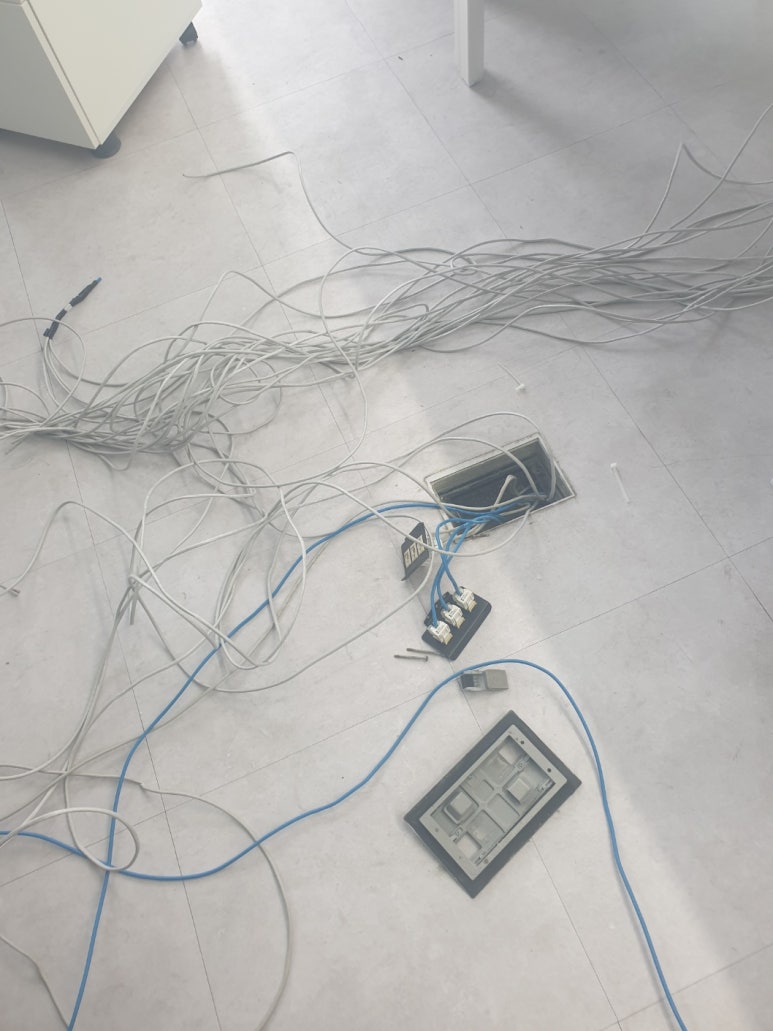 처음에 랜공사를 하려고 보니, 바닥 단자가 불량인 것이 눈에 들어와 어쩔 수 없이 문제가 있는 단자들을 교체 하며 진행이 되었습니다. 처음 작업을 하려고 선 레이아웃을 잡다보니, 상당히 지저분한 상황입니다.