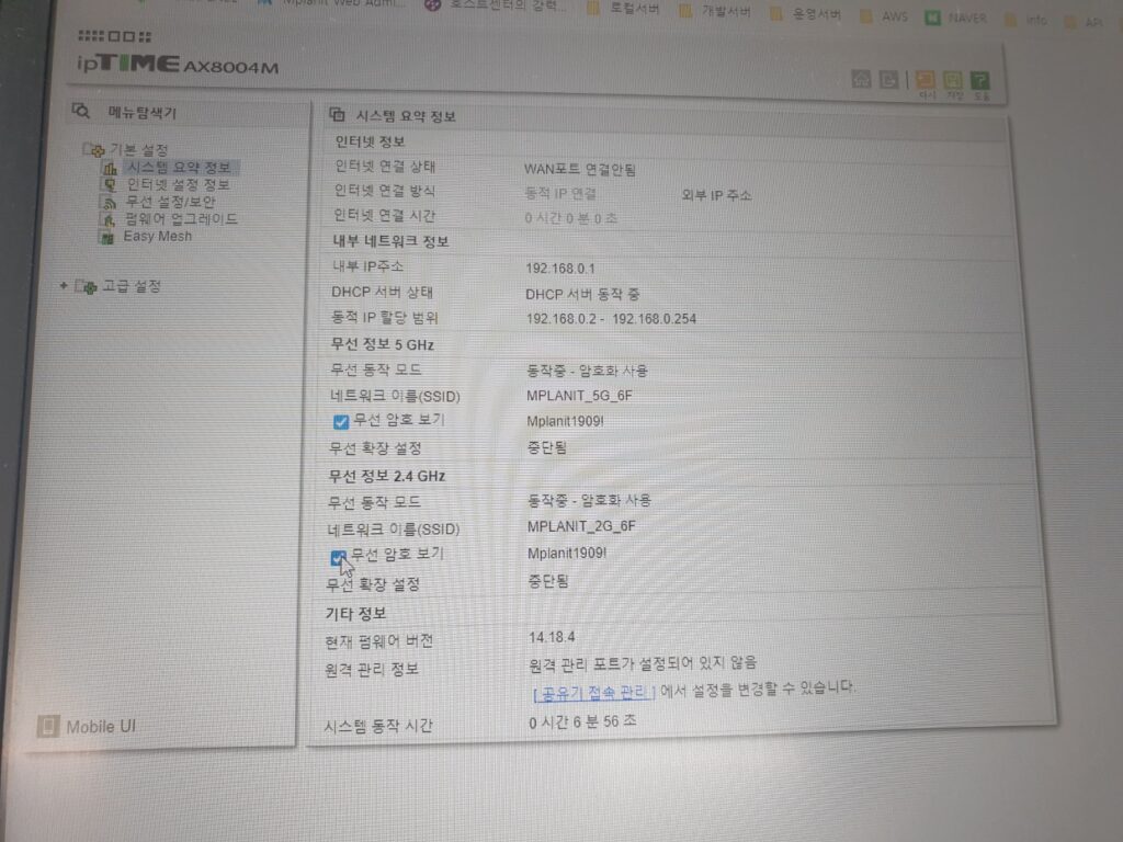 공유기의 무선 와이파이 SSID와 비번도 입력하여 정상적으로 잡아 주었습니다.