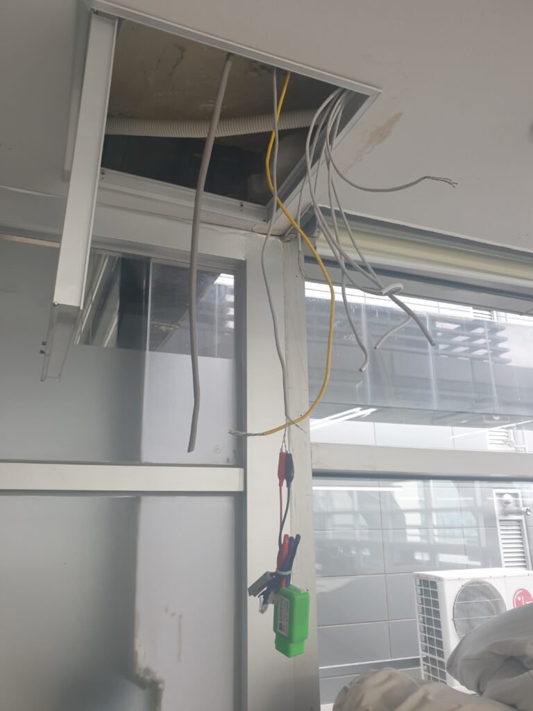 천정 작업도 있어서 깔끔하게 하기위해 점검구를 열어서 미리 선을 끌어놓고 테스터기로 확인 중입니다.